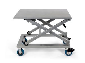 Adjustable, portable cart for a heat press, vinyl cutter, laser cutter, or DTG. It can also double as an extra layout table.